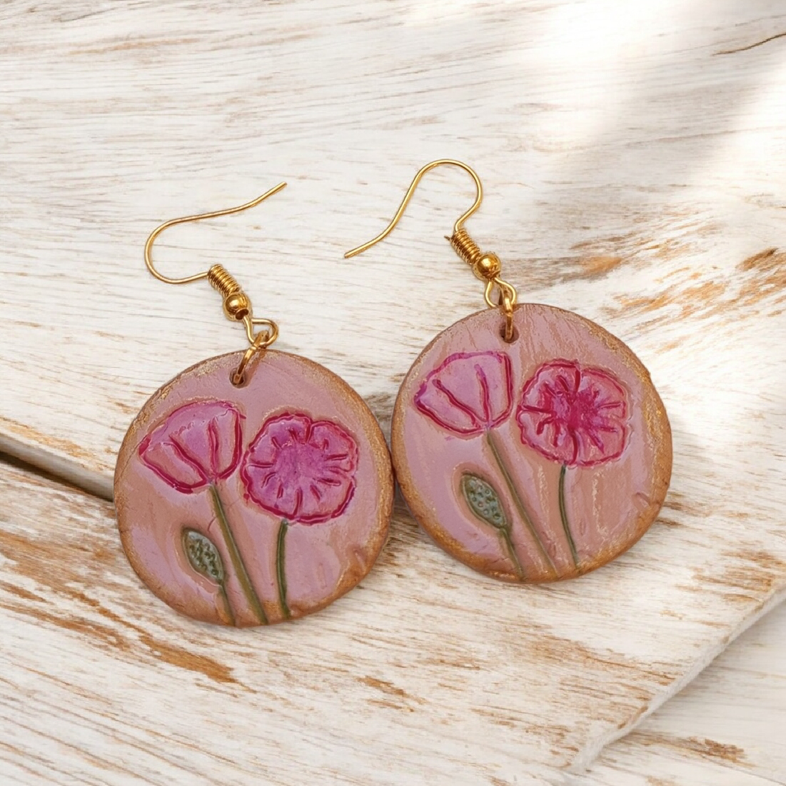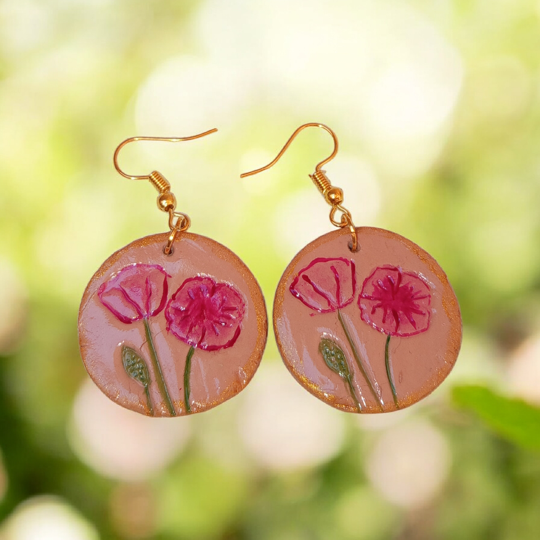 Strălucește cu acești cercei unici decorați cu imprimeu floral de maci, realizați manual din lut polimeric. O piesă romantică și feminină care adaugă eleganță oricărei ținute.