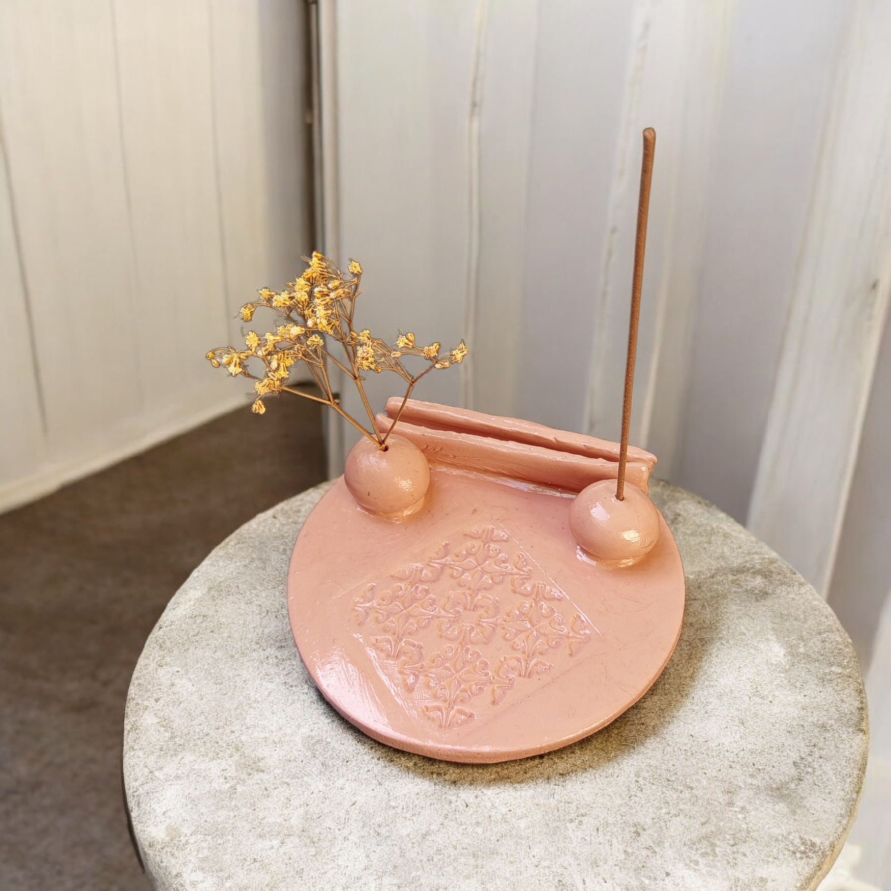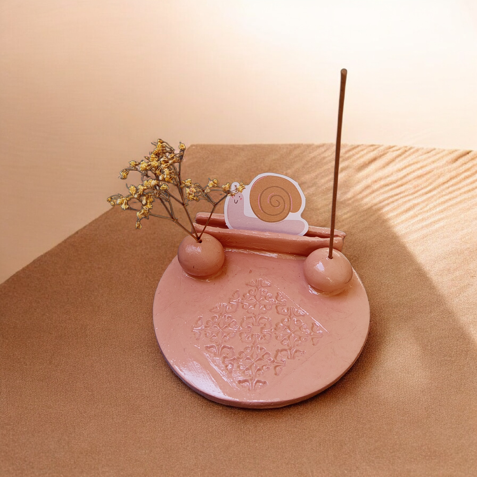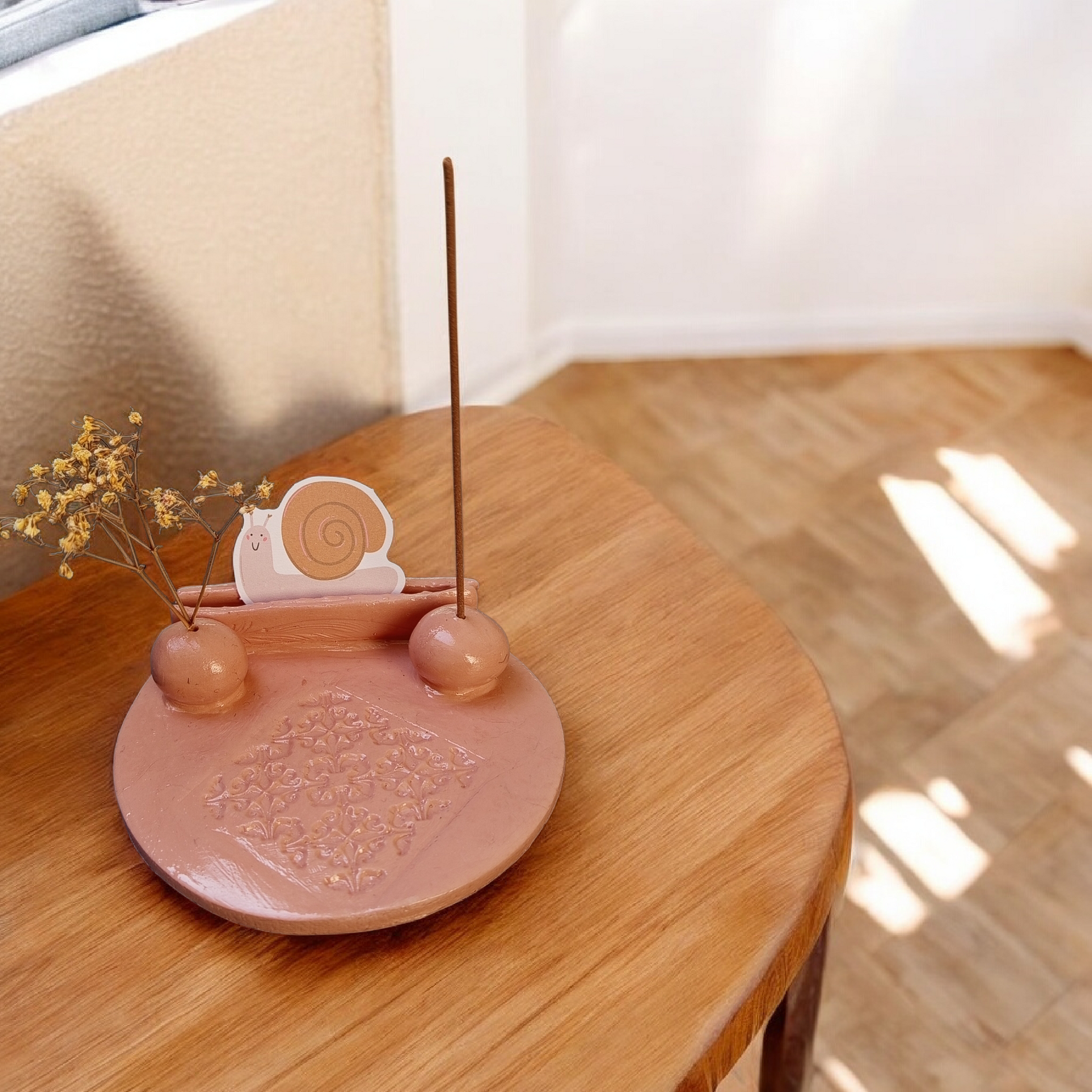 Descoperă acest suport unic pentru bețișoare parfumate, lucrat manual din lut polimeric cu uscare la aer. Fiecare piesă este creată cu atenție la detalii pentru a aduce eleganță și funcționalitate în spațiul tău.